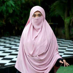 কপালে রয়েছে ক্যাপ, যাতে হিজাবটি মাথায় ঠিকভাবে বসে থাকে।